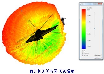 在图示直升机模型上方安装有雷达通信天线,工作频率为1.5GHz。此案例计算了直升机表面电流分布和天线装机辐射方向性图。
