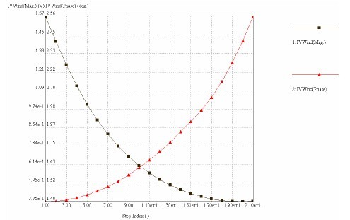 | 根据设置可知,磁芯从中心位置向右移动20mm,共分为21个步骤。计算之后可以得到各个线圈上的感应电压随着磁芯的运动而变化的曲线。下图是左侧第一感应线圈上的感应电压和相位随着磁芯移动的变化曲线。 |