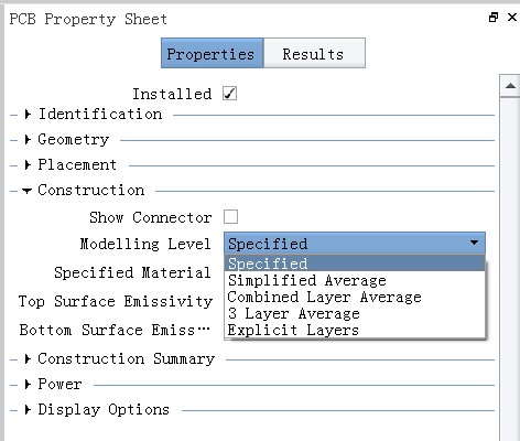Ø 可以直接指定PCB的各向异性导热系数 相比以前的版本,PCB的属性里多了Spcified一项,如果不知道PCB的层数、铺铜量等参数,但知道PCB的导热性能,可利用此项直接设定。